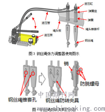 0 引言 隨著我國經(jīng)濟(jì)建設(shè)的不斷發(fā)展,高層建筑大量出現(xiàn),作為運(yùn)行工具,電梯必不可少。連接在轎廂和對(duì)重上的鋼絲繩在電機(jī)的帶動(dòng)下拖動(dòng)轎廂運(yùn)行,它是承受轎廂與對(duì)重重量、傳輸運(yùn)行動(dòng)力的重要部件,它的運(yùn)行情況關(guān)系到電梯的舒適感、鋼絲繩和繩輪的使用壽命以及電梯的運(yùn)行安全,是需要密切關(guān)注的部件。 根據(jù)載重量或型號(hào),不同的電梯含有不同數(shù)量的曳引鋼絲繩,共同承受電梯轎廂與對(duì)重的重量,各鋼絲繩之間的張力差成為影響鋼絲繩運(yùn)行情況的重要因素,《GB/T 10060 電梯安裝驗(yàn)收規(guī)范》(2011)規(guī)定:“任何一根繩或鏈的張力與所有繩或鏈之張力平均值的偏差不能大于5%”,怎樣便捷快速地調(diào)整鋼絲繩的張力使其符合要求成為工程人員面臨的重要問題。 1 鋼絲繩張力調(diào)整的現(xiàn)狀 圖1為鋼絲繩繩頭側(cè)圖示,鋼絲繩的繩頭側(cè)會(huì)安裝繩頭彈簧或橡膠,由于新出廠的繩頭彈簧/橡膠的彈性系數(shù)基本相等,因此其受力后的高度可以間接反映出所受到的力的大小。傳統(tǒng)的鋼絲繩調(diào)整方法就是利用繩頭彈簧/橡膠的高度差來判斷其張力差,考慮到各彈簧/橡膠存在個(gè)體微小差異,因此允許各彈簧/橡膠存在一定的高度差,一般要求高度差不超過2mm。 使用傳統(tǒng)方法調(diào)整鋼絲繩張力的步驟如下: (1)使用螺絲刀插入相互間距很小的繩頭錐套孔,如圖2所示,阻擋螺絲刀轉(zhuǎn)動(dòng),從而防止鋼絲繩發(fā)生轉(zhuǎn)動(dòng),之后將繩頭側(cè)的防轉(zhuǎn)鋼絲繩拆掉; (2)旋松鎖緊迫母,之后根據(jù)各繩頭彈簧的高度差,對(duì)每根鋼絲繩的調(diào)整螺母進(jìn)行調(diào)緊與調(diào)松作業(yè),使其高度差符合調(diào)整要求。 (3)旋緊鎖緊迫母,安裝防轉(zhuǎn)鋼絲繩,取出繩頭錐套孔中的螺絲刀。 以上傳統(tǒng)操作方法通俗易懂,但也存在一定的缺點(diǎn): (1)當(dāng)鋼絲繩長期處于張力不均時(shí),繩頭彈簧/橡膠的彈性系數(shù)會(huì)發(fā)生較大變化甚至產(chǎn)生永久變形,此時(shí)僅依靠繩頭高度差進(jìn)行判斷就不能準(zhǔn)確反映張力情況; (2)電梯有多根鋼絲繩承重,當(dāng)調(diào)整其中一根時(shí),就會(huì)對(duì)其它根產(chǎn)生影響,要使所有鋼絲繩張力相等,需要反復(fù)進(jìn)行調(diào)整,效率較低; (3)當(dāng)電梯載重量較大或者層站較高時(shí),人力逐根調(diào)整鋼絲繩會(huì)非常費(fèi)時(shí)費(fèi)力。 綜合以上特點(diǎn),傳統(tǒng)調(diào)整方法存在精度差,效率低及費(fèi)力的缺點(diǎn),此時(shí)就需要一種較為準(zhǔn)確的調(diào)整鋼絲繩張力的工具或方法。 2 鋼絲繩張力調(diào)整裝置設(shè)計(jì)與解析 根據(jù)以上傳統(tǒng)調(diào)整鋼絲繩的方法中不能同時(shí)精確調(diào)整的缺點(diǎn),結(jié)合液壓的特點(diǎn),設(shè)想是否可以利用液壓原理進(jìn)行調(diào)整工具的設(shè)計(jì)。 2.1 設(shè)備原理 若將相互連通的液壓缸安裝在繩頭側(cè),使每根鋼絲繩的拉力作用在液壓缸上,則每個(gè)液壓缸所受到的壓力應(yīng)該都是相同的?;谠撛恚疚脑O(shè)計(jì)了一種液壓型的鋼絲繩張力調(diào)整器,其基本結(jié)構(gòu)由液壓泵,液壓缸、鋼絲繩防轉(zhuǎn)裝置以及其它附件組成,原理如圖3所示。通過在鋼絲繩端部的彈簧座上設(shè)置液壓缸,液壓泵加壓使各液壓缸全部升起時(shí),各液壓缸活塞所受的壓力相同,將各繩頭錐套桿以均等的力提拉,從而使各鋼絲繩的張力保持一致,收緊調(diào)整螺母和迫緊螺母,調(diào)整完成。 2.2 設(shè)備操作要點(diǎn) 以1:1吊掛的電梯為例,在使用本文中的鋼絲繩張力調(diào)整裝置時(shí),相關(guān)操作要點(diǎn)及步驟如下: (1)在轎廂側(cè)/對(duì)重側(cè)安裝鋼絲繩防轉(zhuǎn)裝置,以防作業(yè)過程中出現(xiàn)鋼絲繩轉(zhuǎn)動(dòng)進(jìn)而使鋼絲繩從繩頭板中脫出,如圖4。 (2)稍微擰松鎖緊迫母,將液壓缸底座、液壓缸依次放在彈簧座上,之后用可以壓緊液壓缸活塞的帶螺紋的提拉管進(jìn)行鎖緊,在繩頭螺桿上安裝防脫銷。如圖5。 (3)使用液壓泵對(duì)液壓缸進(jìn)行加壓,當(dāng)所有液壓缸的活塞都升起時(shí)且提升高度均小于(不能等于)活塞的提升范圍時(shí),說明各鋼絲繩張力調(diào)整均勻。 (4)作業(yè)人員用手通過液壓缸底座小窗向下旋緊調(diào)整螺母及鎖緊迫母,之后拆掉防脫銷、提拉管以及液壓缸和液壓缸底座,裝回防轉(zhuǎn)鋼絲繩。 注意:液壓缸加壓時(shí),可能會(huì)出現(xiàn)某幾個(gè)活塞已經(jīng)提升至最大行程,但仍有部分液壓缸未升起的情況,此時(shí)對(duì)于已經(jīng)提升的活塞,錐套桿會(huì)被相應(yīng)的提拉,因此調(diào)整螺母及鎖緊迫母也會(huì)被提拉,作業(yè)人員可以用手通過液壓缸底座上的小窗向下擰緊調(diào)整螺母及鎖緊迫母,如圖6,之后松開提拉管,按壓液壓缸活塞使其恢復(fù)原狀后,如圖7,再重新鎖緊提拉管,重復(fù)之前的步驟進(jìn)行加壓提升液壓缸,直至所有液壓缸活塞都升起,且行程都小于(不能等于)活塞的最大行程。 2:1吊掛的電梯在轎廂和對(duì)重側(cè)調(diào)整完畢后,由于中部鋼絲繩可能“積氣”,最好電梯上下運(yùn)行幾次,再重復(fù)以上步驟進(jìn)行